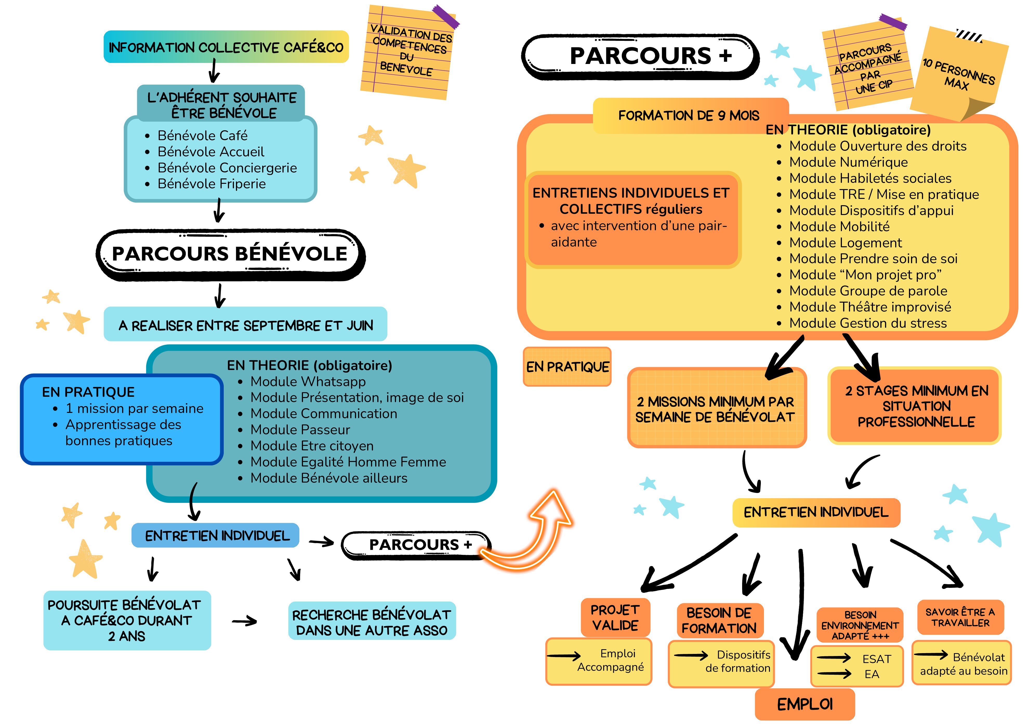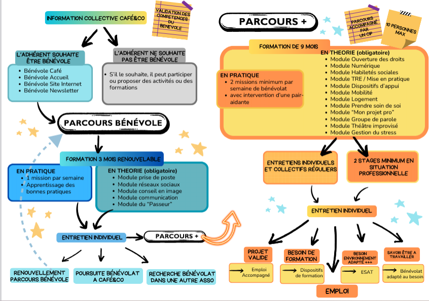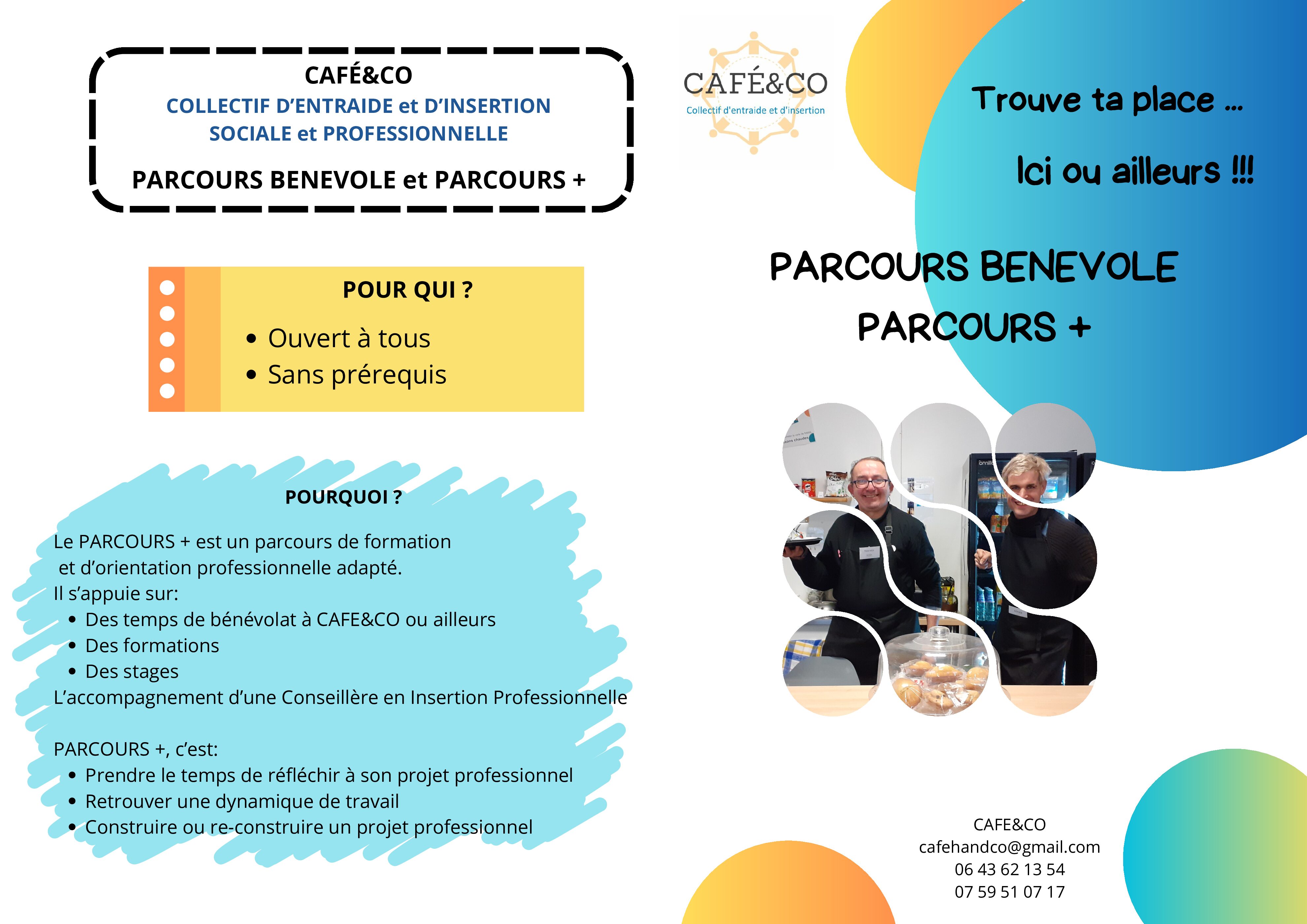 Ce dispositif s’adresse a des personnes, sans pré requis, qui souhaitent travailler ou retravailler leur projet professionnel ou bénévole. Il comprend deux missions de bénévolat par semaine à Café&Co ou dans d’autres structures, mais également deux stages minimum en entreprise durant la période de formation.